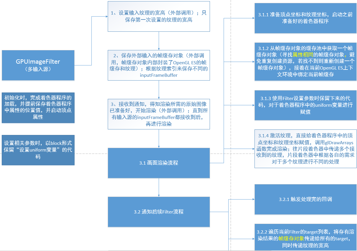 (4) GPUImage框架中许多复杂滤镜都是通过这种滤镜之间传递帧缓存对象的操作来实现的,在前一个滤镜渲染完成后会自动触发下一个滤镜的渲染操作,直到滤镜链上的最后一个滤镜完成渲染为止。
